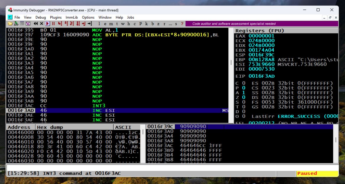 The lower left corner of the Immunity window now says "INT3 command", as shown below.