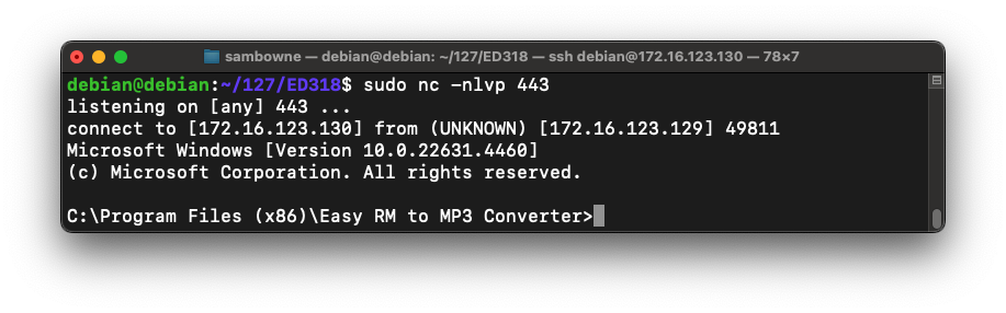 This command makes an exploit that will connect from the Windows target back to the Linux attacker on port 443 and execute commands from Linux.