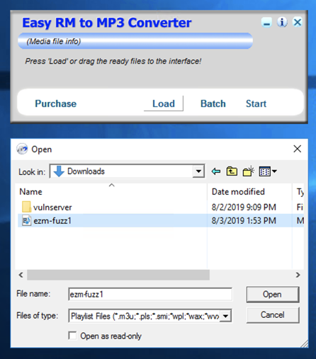 In "Easy RM to MP3 Converter", open the ezm-fuzz3.m3u file.