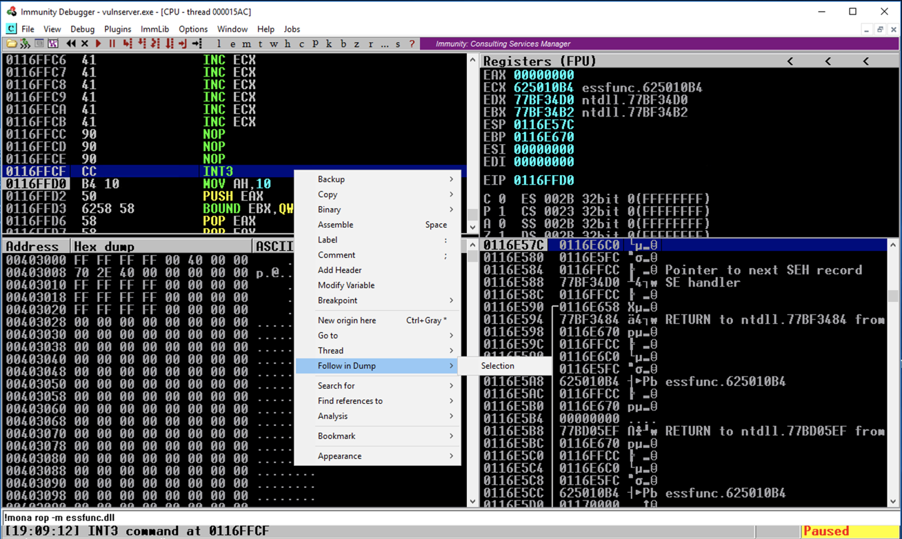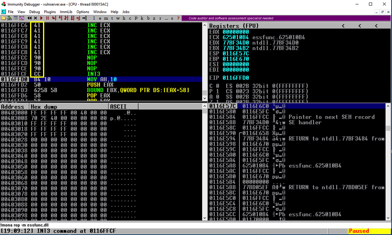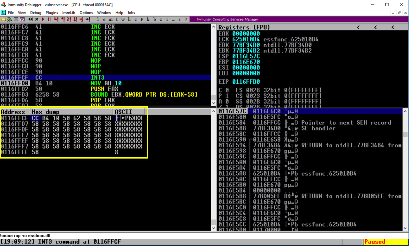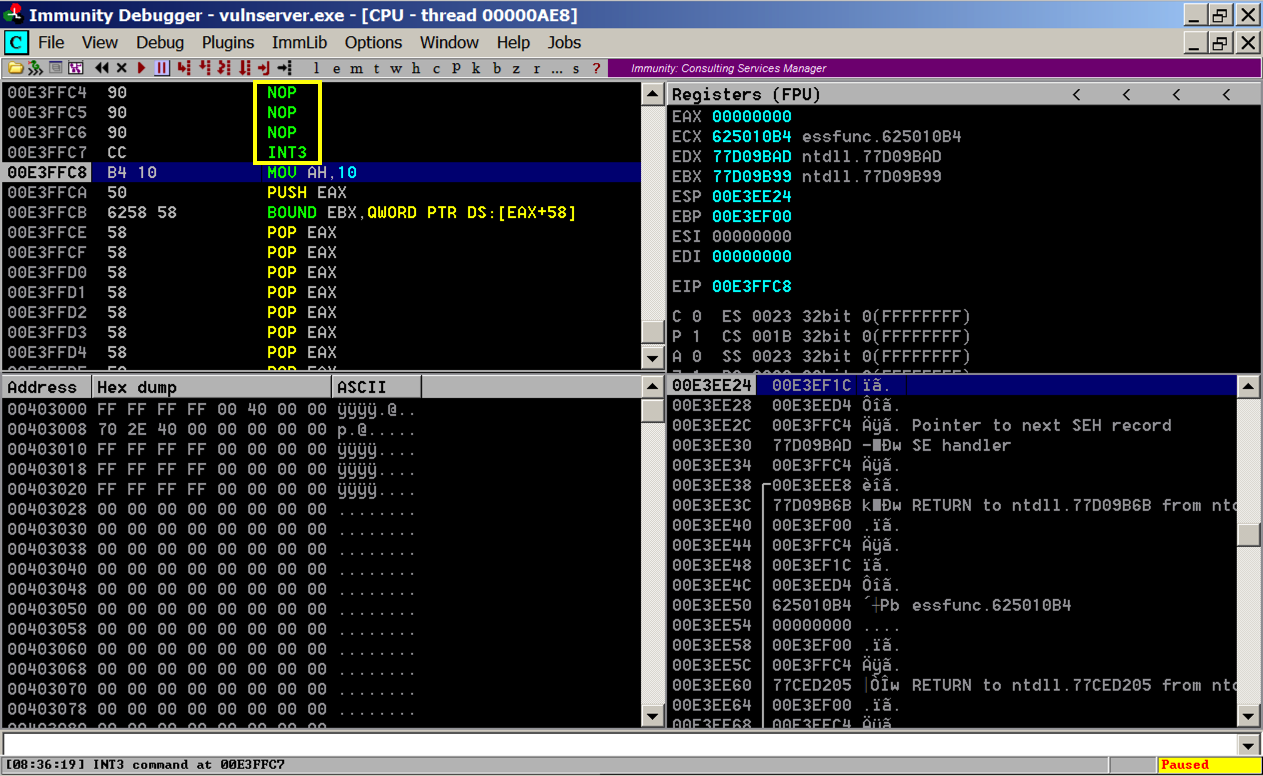 In Immunity, in the top left pane, scroll up a few lines. There are three NOP instructions before the INT3 that stopped execution, as shown below. This is our four byte "shell" code.