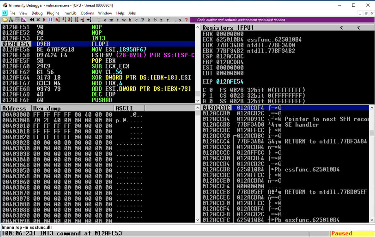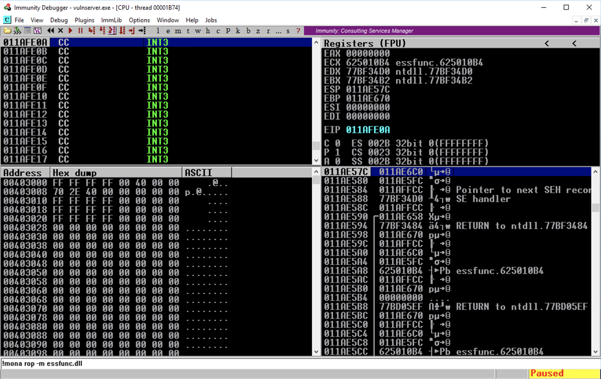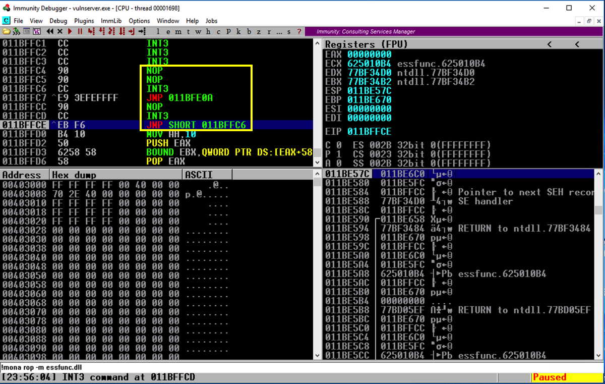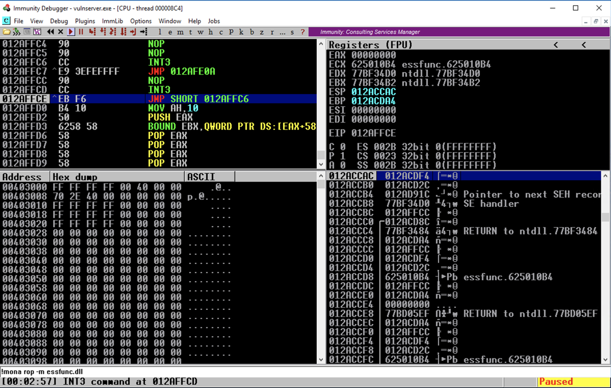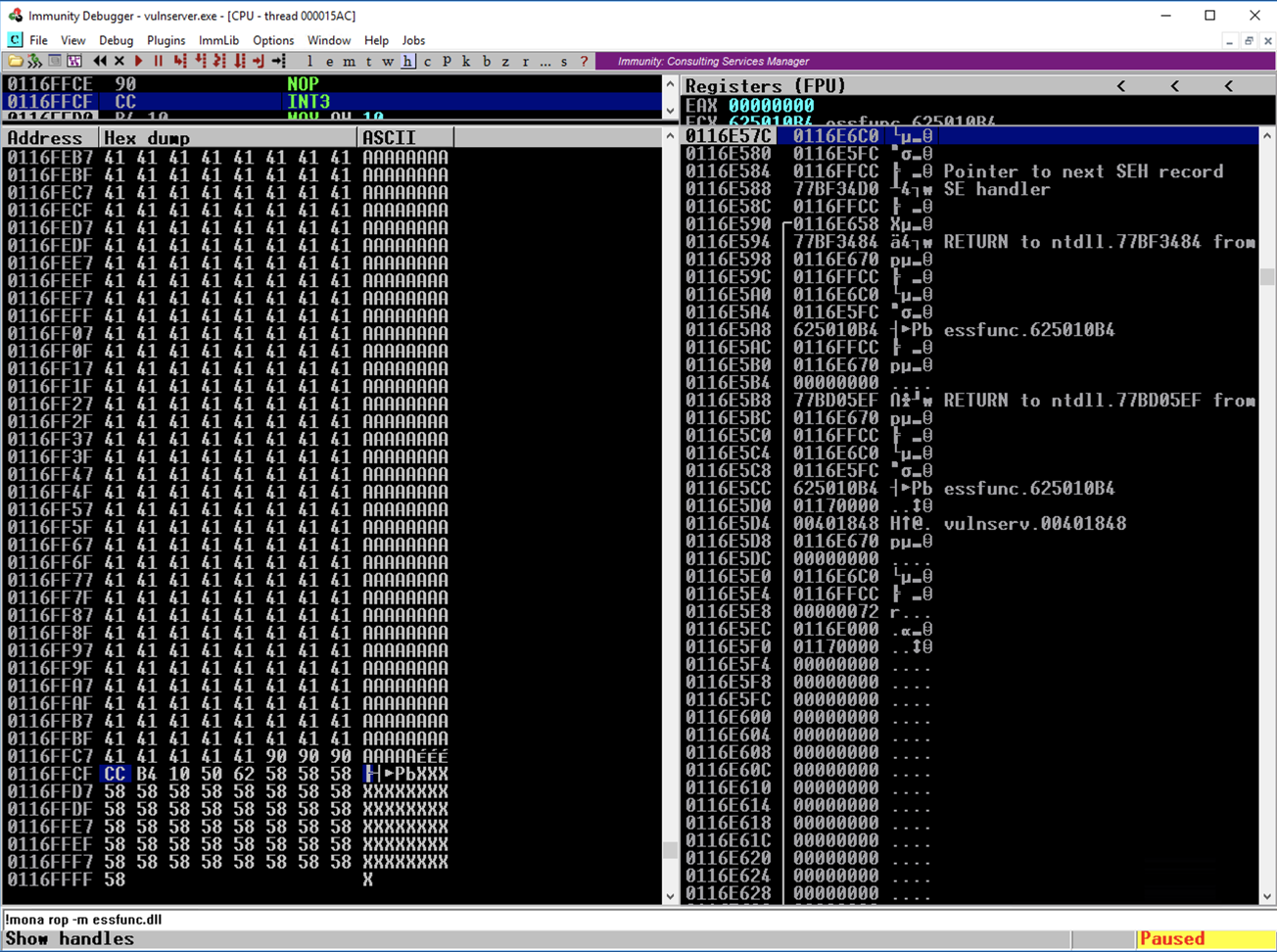 In Immunity, in the top left pane, scroll up a few lines. There are three NOP instructions before the INT3 that stopped execution, as shown below. This is our four byte "shell" code.