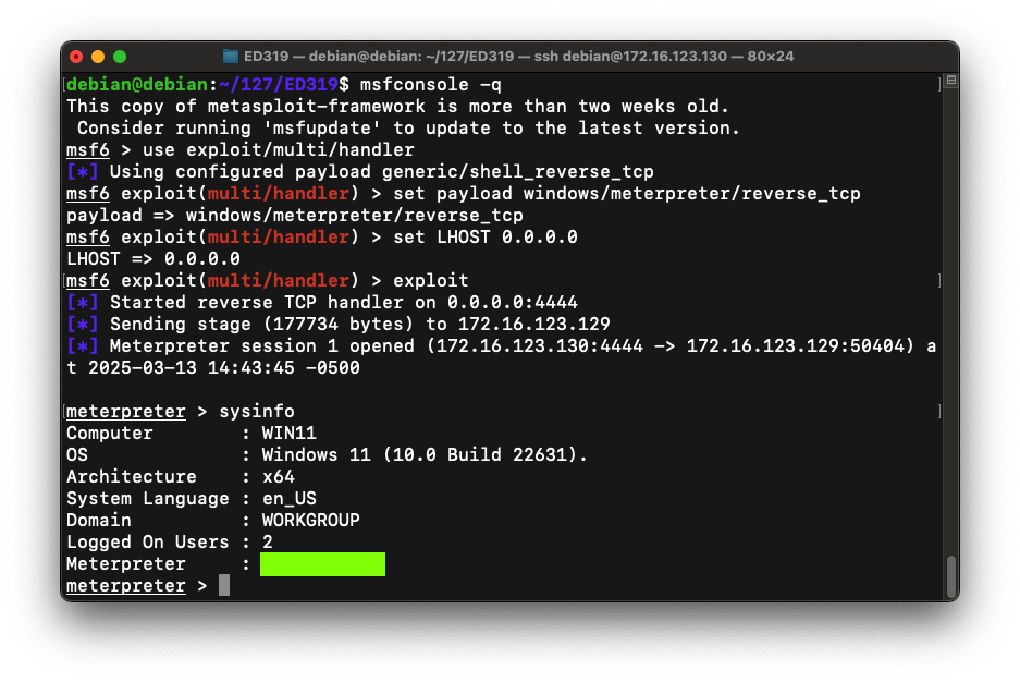 On your Linux machine, in the Terminal window running the exploit handler, you should see a Metpreter session open, as shown below.Execute this command: