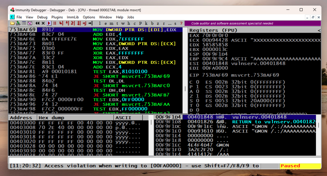 In the lower left pane, scroll up to see the "A" characters we injected. There are hundreds of them. This is a good place to put shellcode.