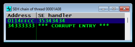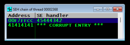 As shown below, the SEH chain is corrupt, containing an "SE Handler" value made up of four of the numerals in the exploit.