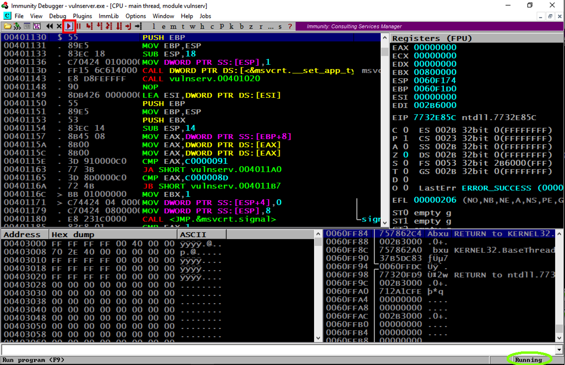 In the Immunity toolbar, at the top left, click the magenta "Run" button, which is outlined with a red square in the image below.