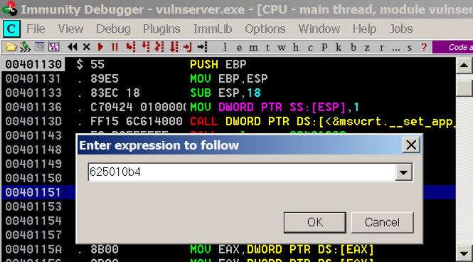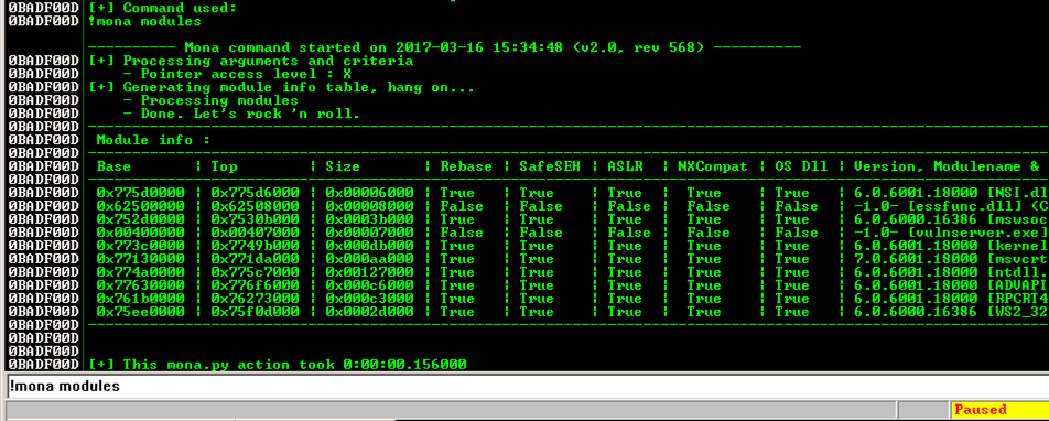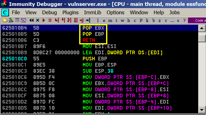 There are two modules without any of these protections: essfunc.dll and vulnserver.exe. However, vulnserver.exe is loaded too low in memory, so its addresses begin with a null byte.