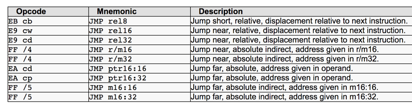 The JMP instructions available for the x86 (and x64) processors are shown below, from this page.