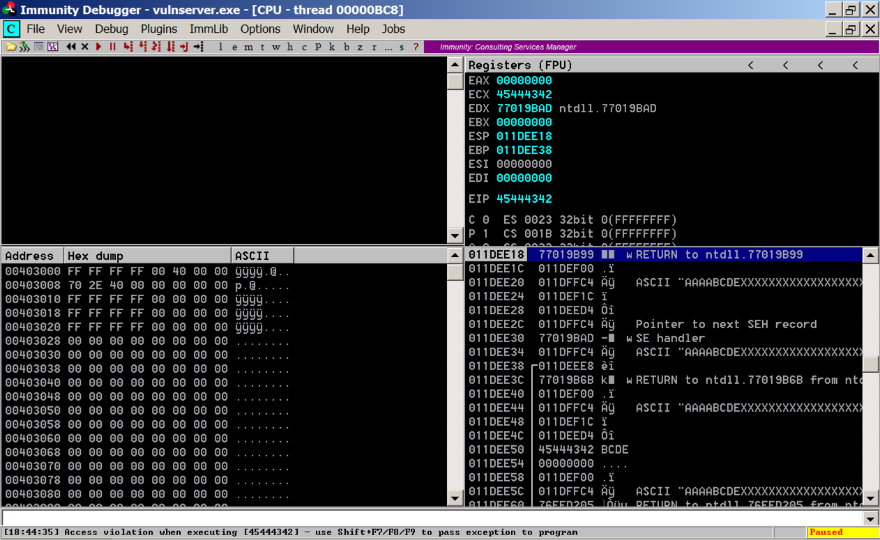 Press Shift+F9. (If you are using VMware Fusion on a Mac, press Shift+fn+F9.) Now Immunity says "Access violation when executing [45444342]", as shown below.