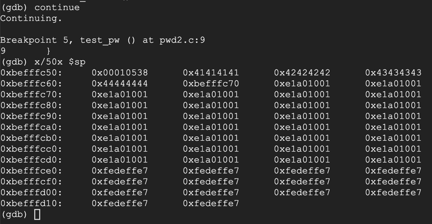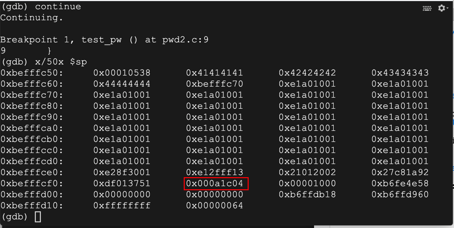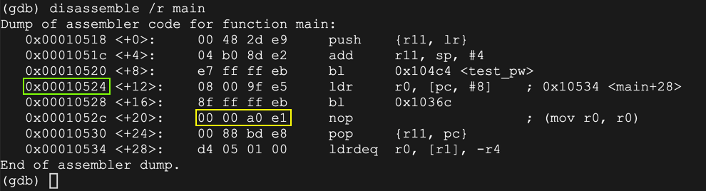 Also note the address of the instruction after the call to "test_pw" is 0x00010524.