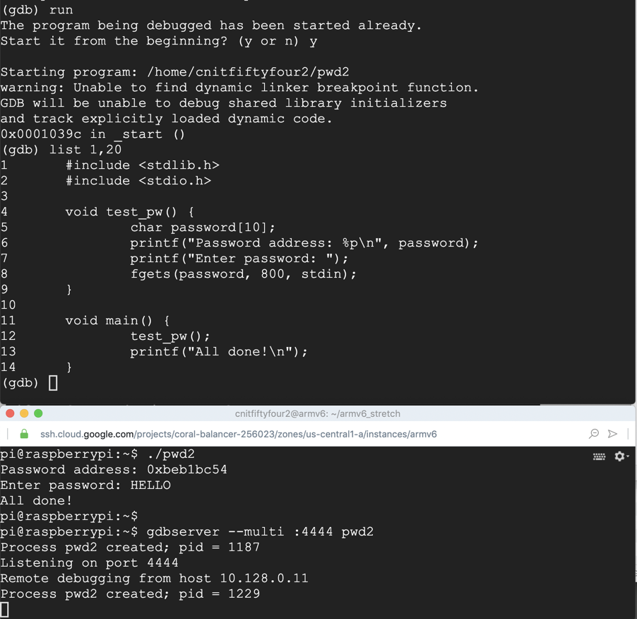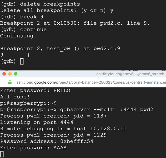 On your Debian instance running gdb, execute these commands to finish execution and close the gdbserver session.