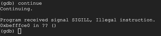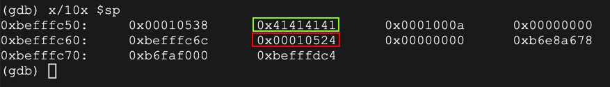 Also note that the address 0xbefffc70 appears a few words further down the stack. We'll place exploit code there.