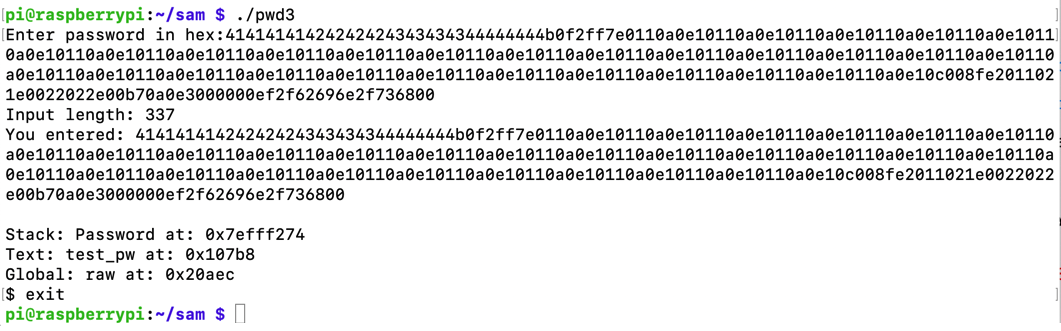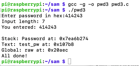 To see it in action, run the "pwd3" program several times with a password of 41. The password address is different every time, as shown below.