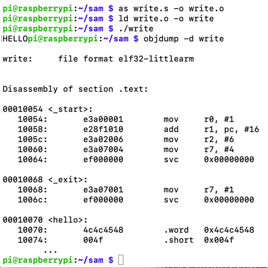 adr r1, hello // memory address of string