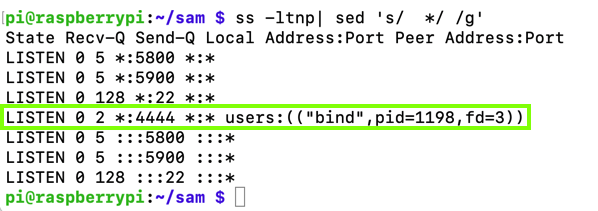 ss -ltnp| sed 's/ */ /g'