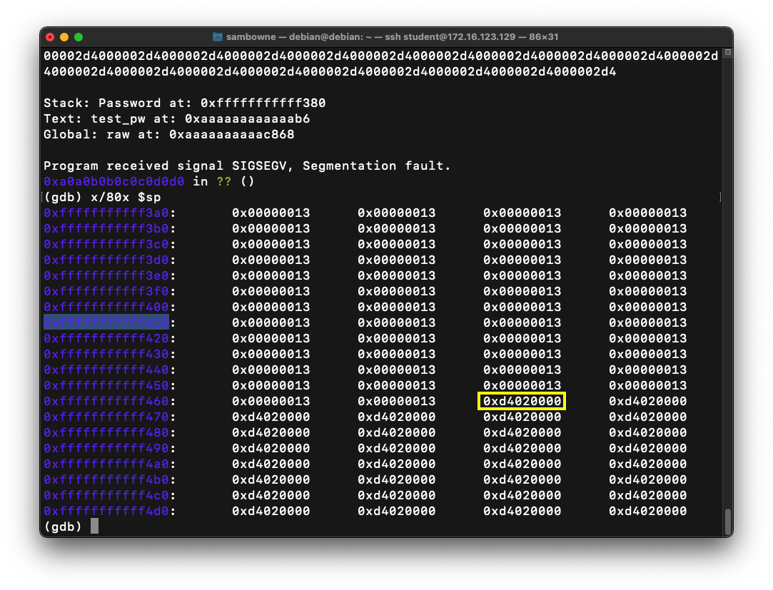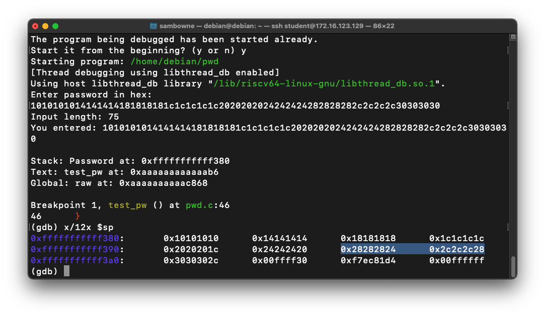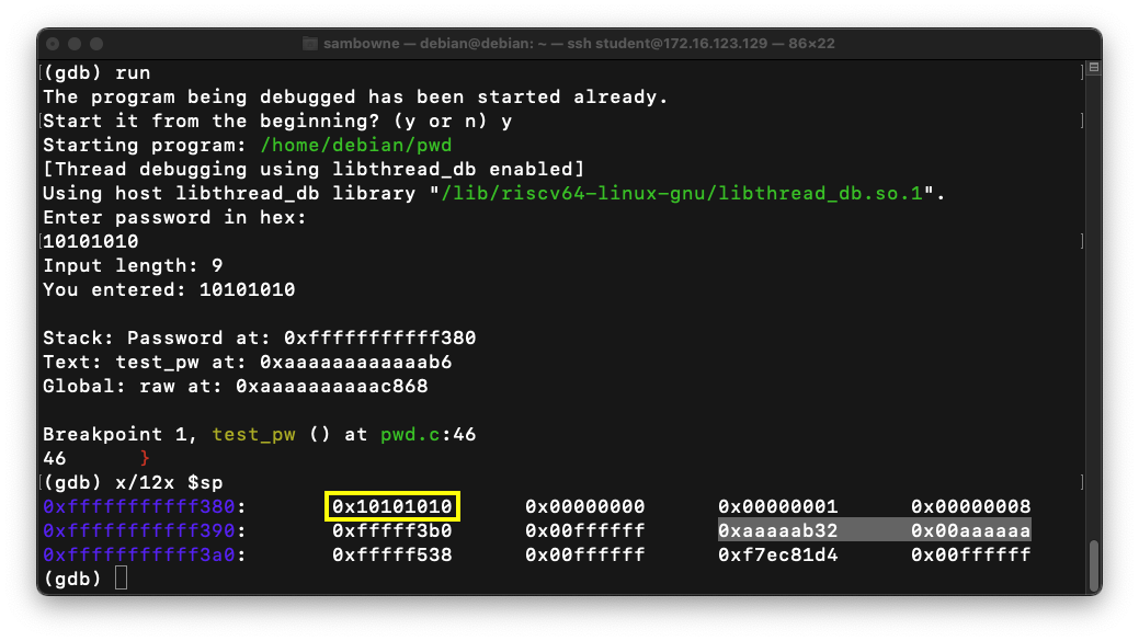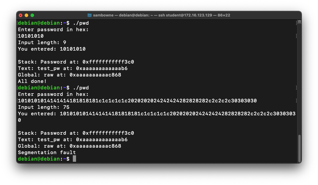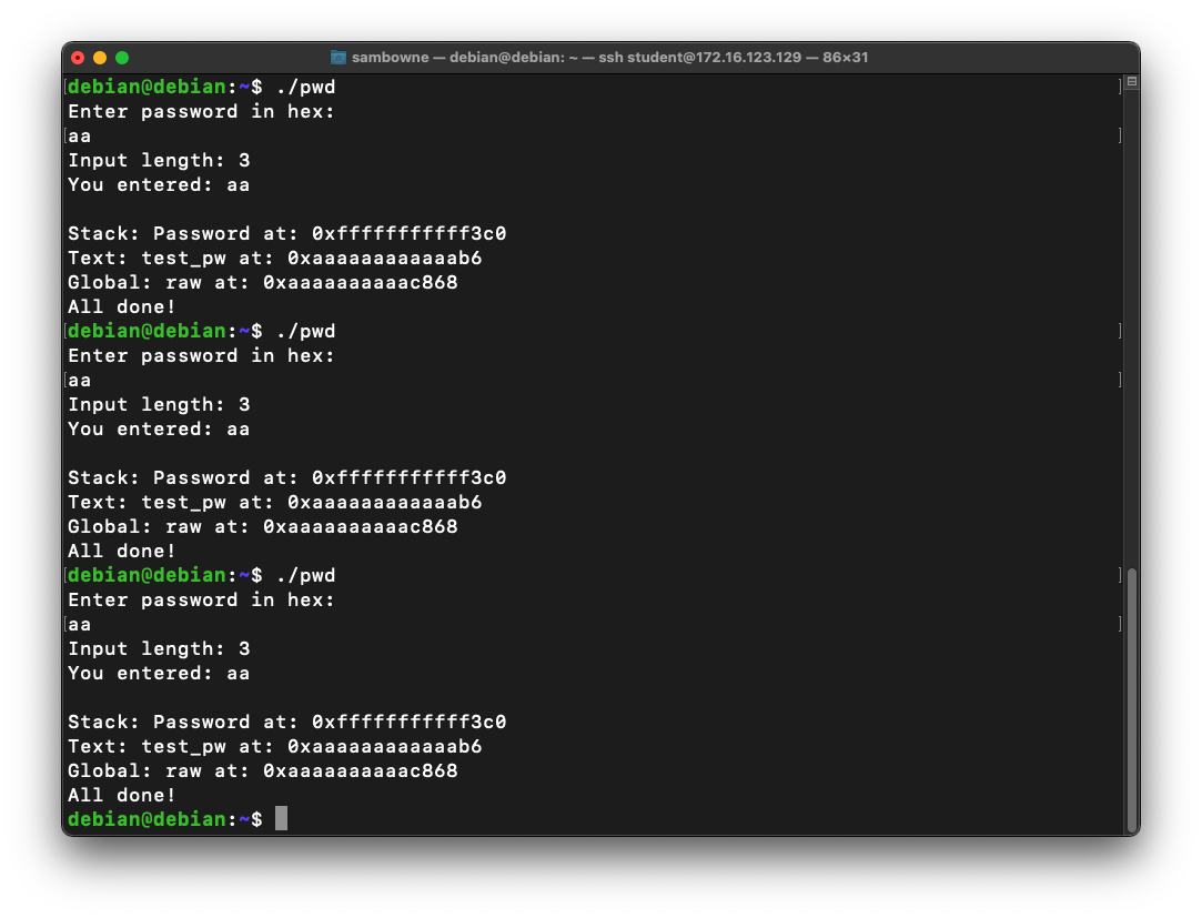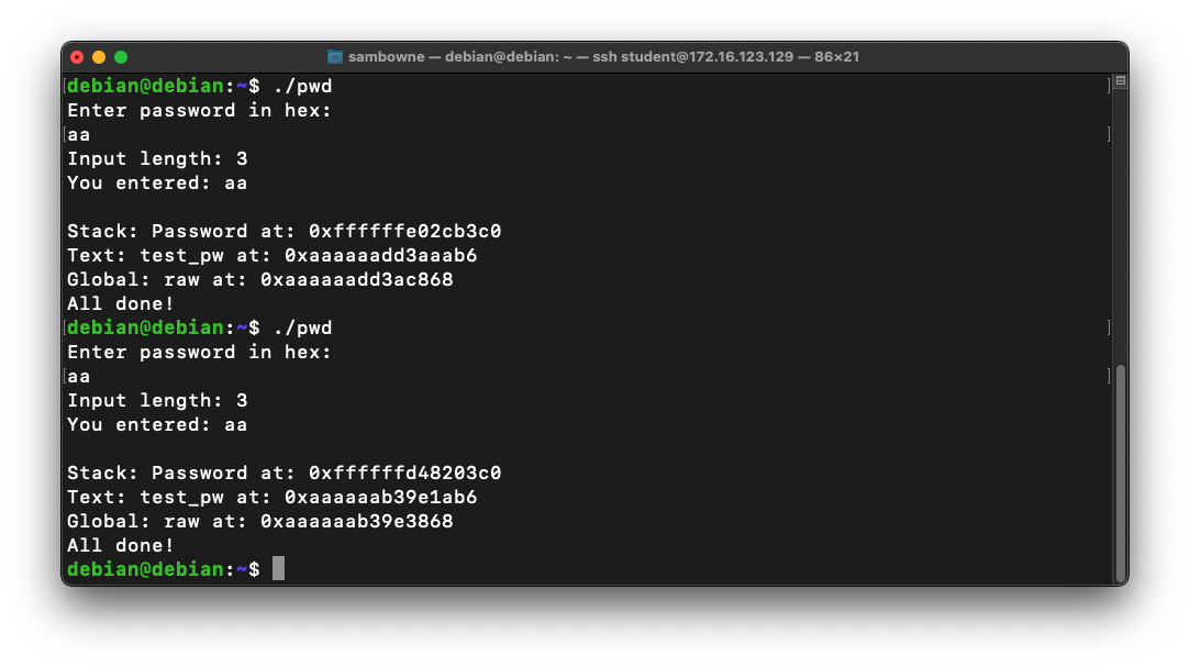 To see it in action, run the "pwd" program several times with a password of aa. The password address is different every time, as shown below.