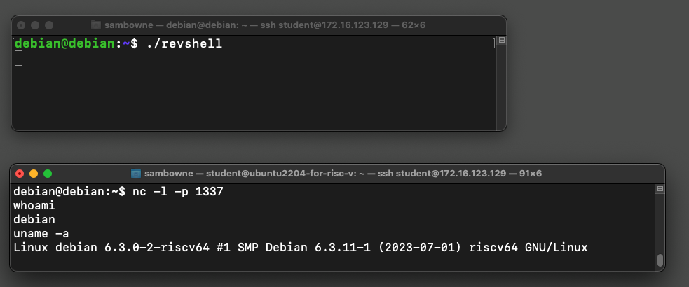 On your RISC-V emulated machine, in an SSH window, at the debian@debian:~$ prompt, execute these commands, as shown below.