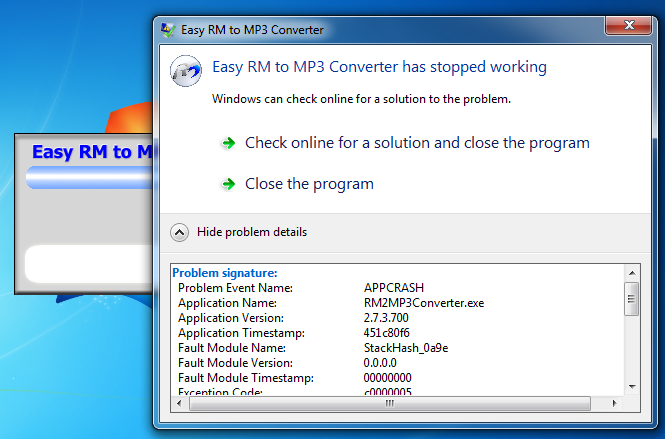 Now it crashes, with the message "Easy RM to MP3 Converter has stopped working". The details say "APPCRASH", as shown below:
