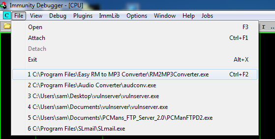 In Immunity, click File. In the lower section, click item 1: "C:\Program Files\Easy RM to MP3 Converter\RM2MP3Converter.exe", as shown below.