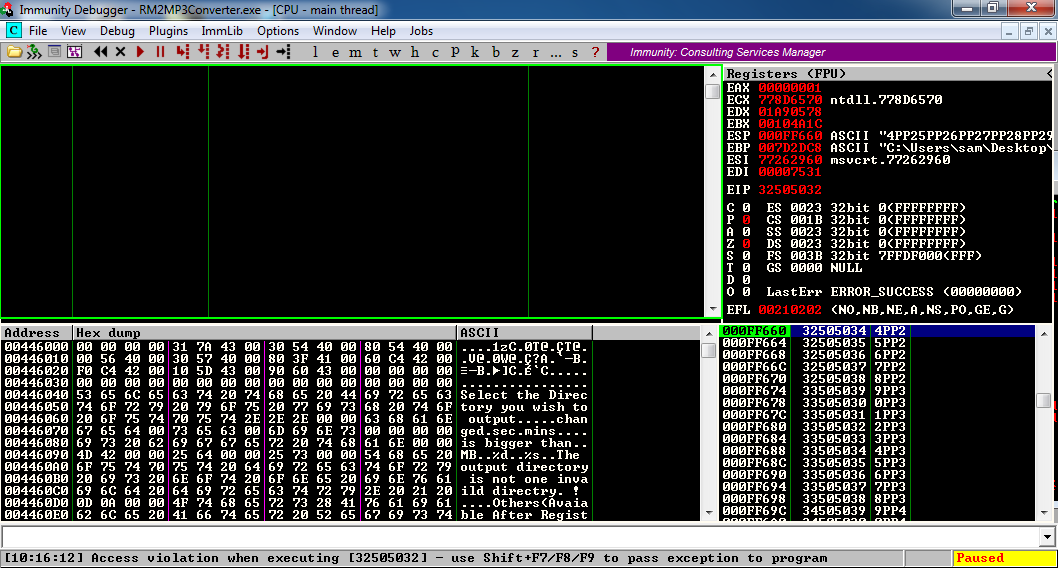In Immunity, click File. In the lower section, click item 1: "C:\Program Files\Easy RM to MP3 Converter\RM2MP3Converter.exe".