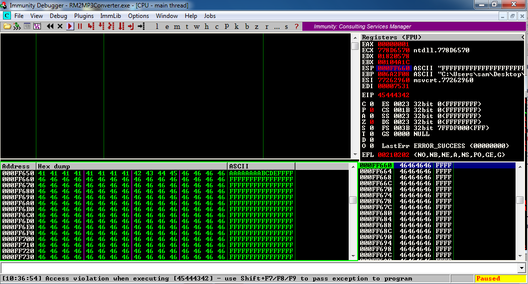 The lower left corner of the Immunity window now says "Access violation when executing [45444342]", as shown below.