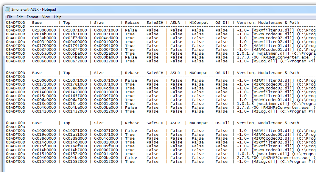I saved logs from three runs of Immunity, and kept only the modules with ASLR=False.