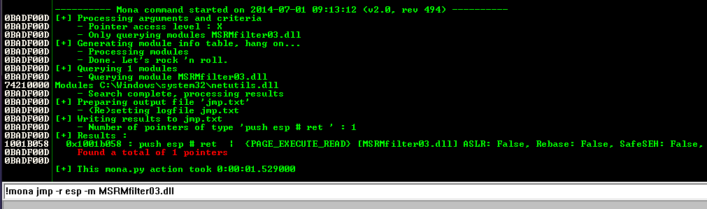 !mona jmp -r esp -m MSRMfilter03.dll