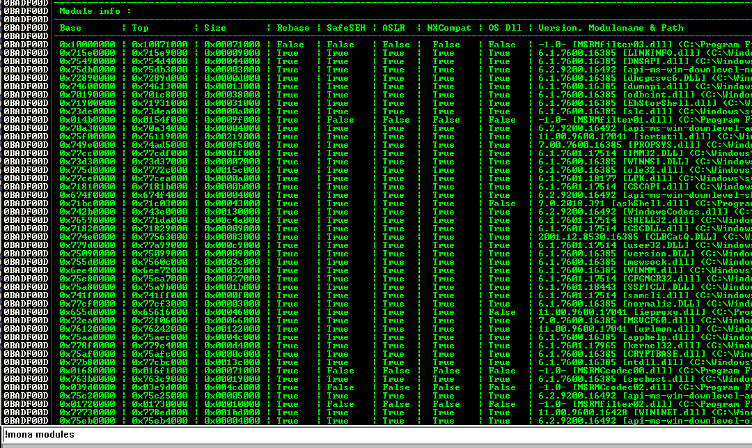 The best thing would be to find one with ASLR=False and Rebase=False, but the only module like that is RM2MP3Converter.exe. However, we can't use that module, because it has a null byte in its address.