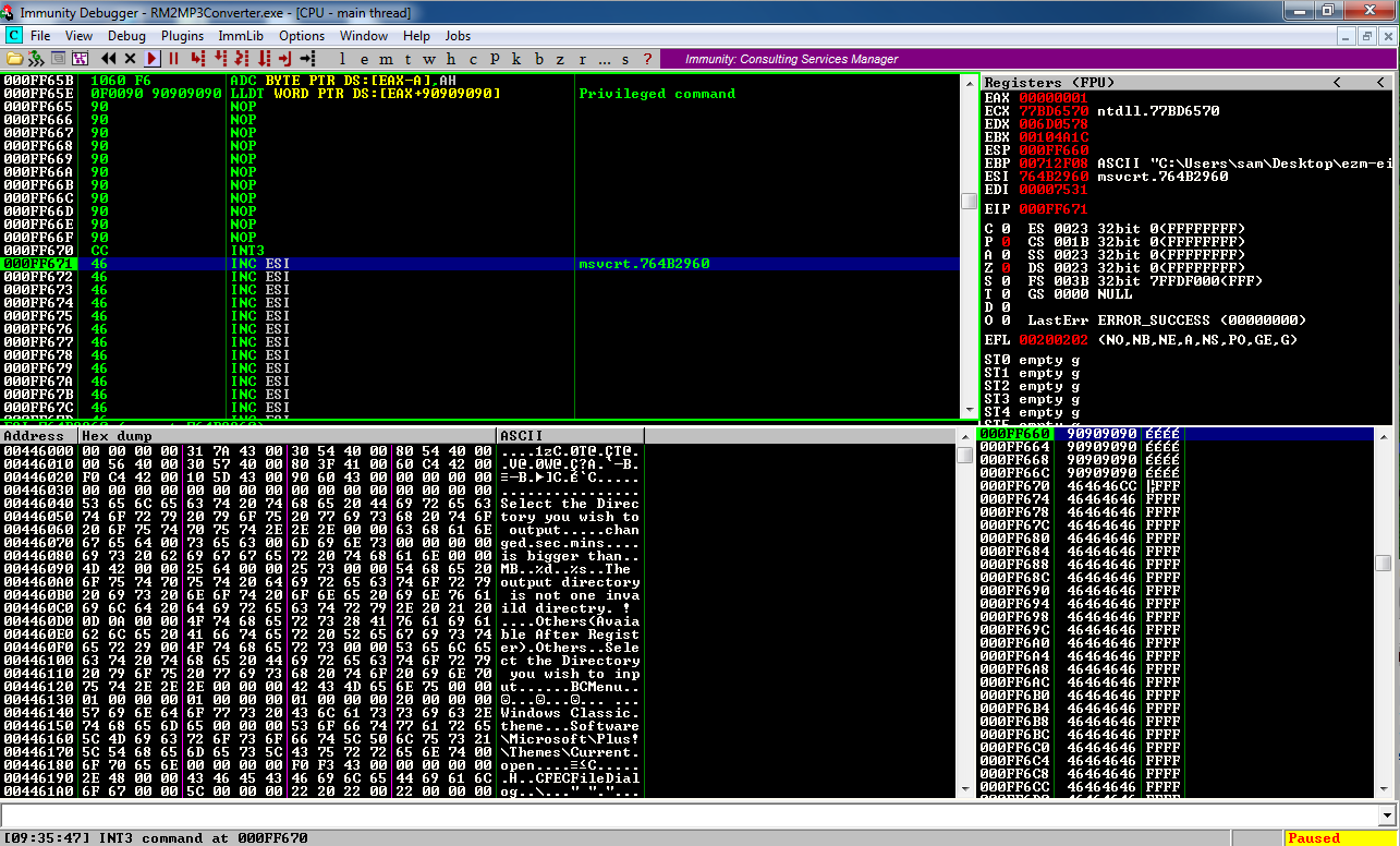 In the upper left pane of Immmunity, scroll up to see the NOP sled, followed by the INT3.