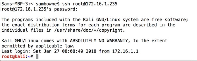 If you don't change the Kali default password, anyone on your network can use your machine. To prevent that, use the passwd command to change your password.You also need to replace the default Kali SSH keys to have any real security.