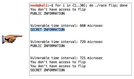 Therefore, it takes around 3000 microseconds to flip the link, and the vulnerable period is around 600 microseconds. So there's a 20% chance or so of the flip occurring during the vulnerable period. If we run the program 30 times, it should succeed for some of them.