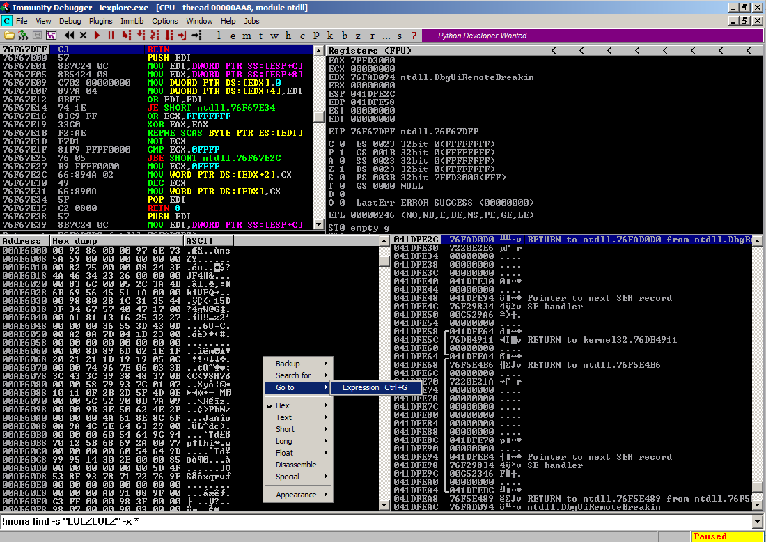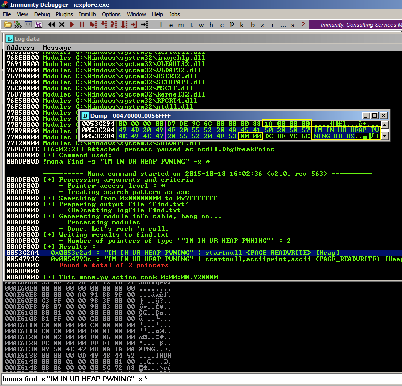 Mona is searching the entire userland RAM space, which may take a few minutes.!mona find -s "IM IN UR HEAP PWNING" -unicode -x *