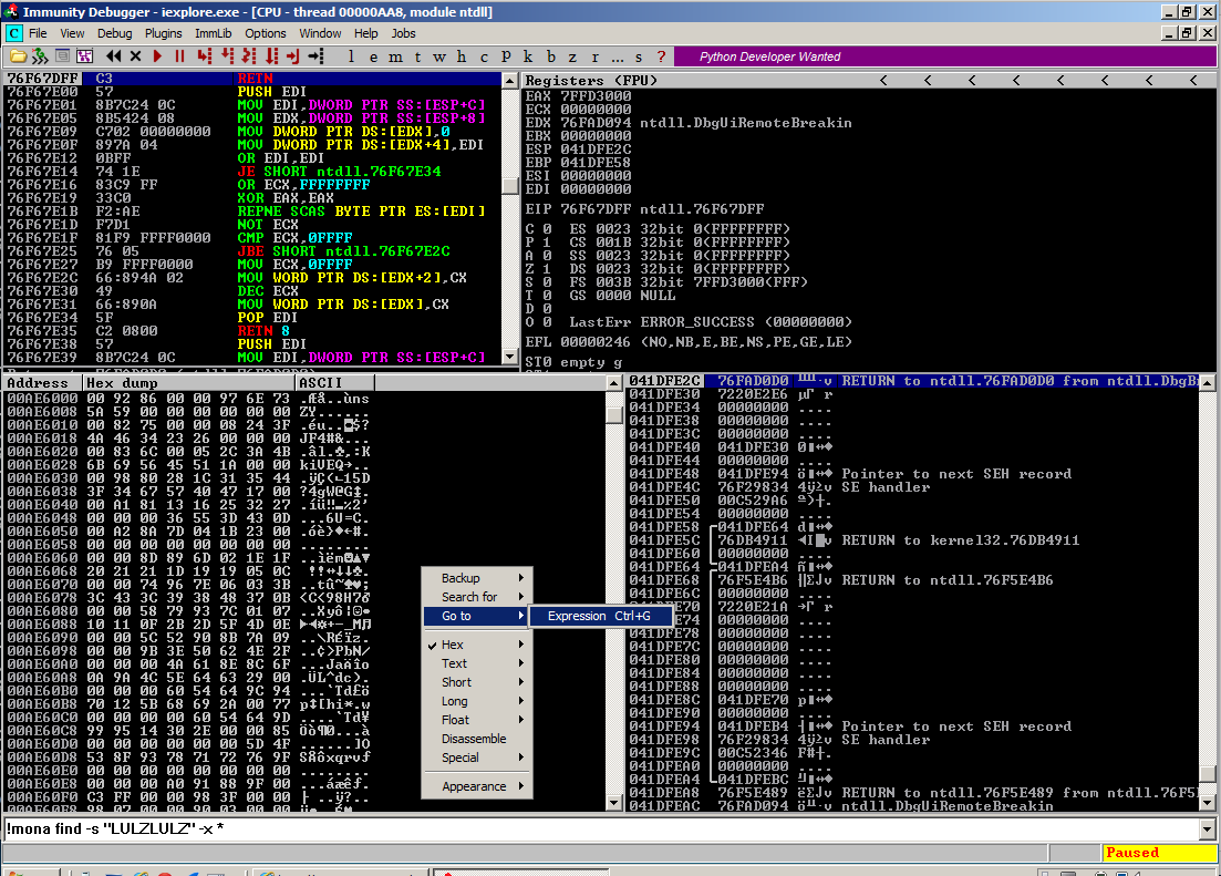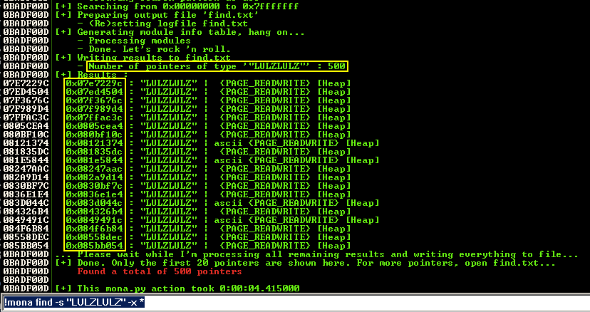 Mona found 500 hits, with many different addresses, as shown below.!mona find -s "LULZLULZ" -x *