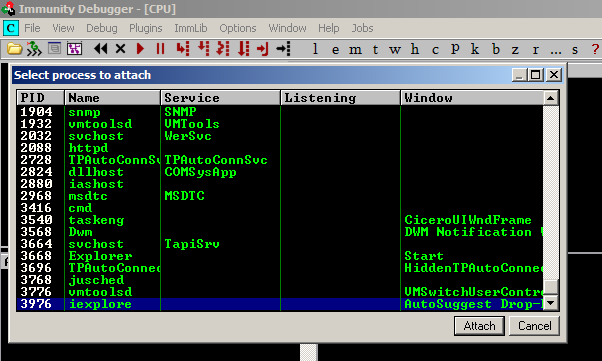 SStart Immunity, click File, Attach, and attach the iexplore process.