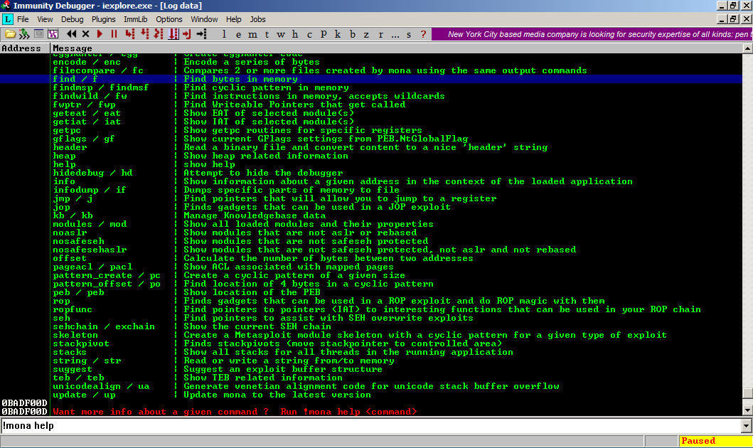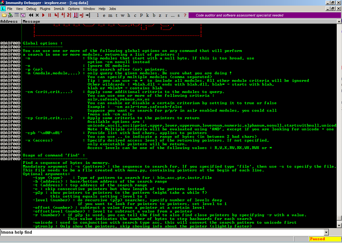 The help message shows the Mona commands. One of them is "find", as shown below.!mona help