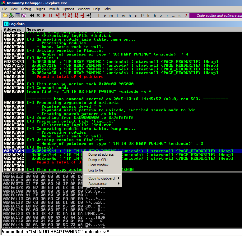 As shown below, the text now appears as ASCII, not Unicode:!mona find -s "IM IN UR HEAP PWNING" -x *