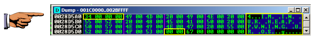 A Dump window appears. Scroll down one line to show the RAM before the "IM IN UR HEAP PWNING" string, as shown below.