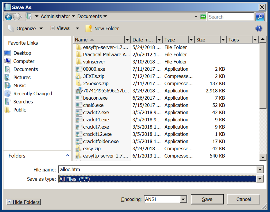 Save the file in your Documents folder, with the filename alloc.htm. When saving, at the bottom of the Save As box, change "Save as type" to "All Files", as shown below. Otherwise Notepad will add a ".txt" file extension to the filename and the Javascript won't run.