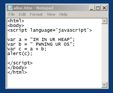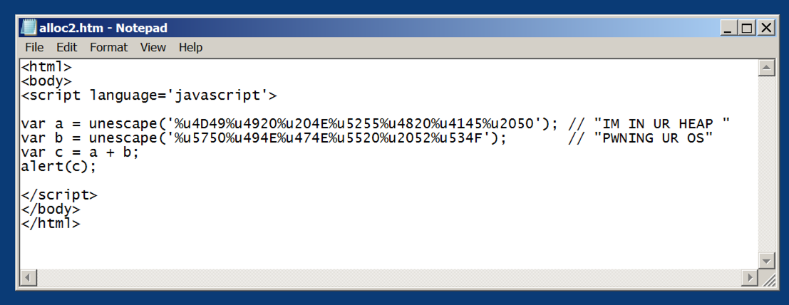 Save the file in your Documents folder with the name alloc2.htm, as shown below.<html> <body> <script language='javascript'> var a = unescape('%u4D49%u4920%u204E%u5255%u4820%u4145%u2050'); // "IM IN UR HEAP " var b = unescape('%u5750%u494E%u474E%u5520%u2052%u534F'); // "PWNING UR OS" var c = a + b; alert(c); </script> </body> </html>