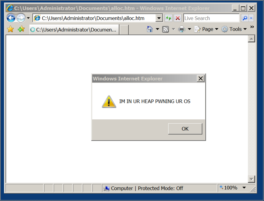 You see an alert box, saying "IM IN UR HEAP PWNING UR OS", as shown below.